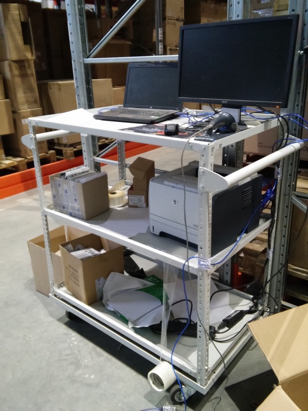 Недавно к нам обратился постоянный заказчик с просьбой реализовать передвижное рабочее место для сотрудников склада. Склад уже оборудован палетными стеллажами серии Prostor XL. Для целей оперативного управления, а также на время проведения инвентаризаций и ревизий персоналу требуется полноценное рабочее место в непосредственной близости от зоны хранения. Техническое задание предусмотрело большие нагрузки на стеллаж, так как оператор должен иметь возможность  работать в автономном режиме без доступа к электропитанию. Для чего на полки могут устанавливаться ИБП (Источник бесперебойного Питания) и аккумуляторы для него. Полка имеет размеры 1000мм х 600мм и выдерживает 200кг. Высота стеллажа 1200мм (1320 с колесами).