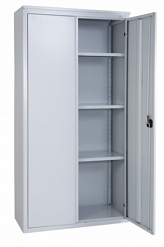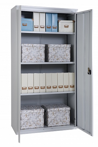 Широкий односекционный металлический шкаф ALR - 2010 комплектуется двумя дверьми с ригельным замком. В качестве ручки выступает фигурный гиб дверей, что экономит пространство и добавляет двери жесткости. Двери открываются до 110 градусов, а внизу шкафа есть магнит, для их фиксации в закрытом виде. В комплект входят три полки с нагрузкой до 100 кг, которые можно установить на разных уровнях с помощью зацепов. Шкаф легко собрать самостоятельно на винты и саморезы (в комплекте). Шкаф используется для хранения офисной документации и архивов, в также канцелярских и прочих офисных принадлежностей. Производитель предоставляет 3 года гарантии на шкаф. Поставляется в разобранном виде. Шкаф окрашен порошковой краской серого цвета. Данное покрытие помогает предотвратить образование царапин и сколов, а также позволяет размещать шкаф в помещении с повышенным уровнем влажности. В шкаф можно добавить дополнительную полку (опция). При заказе от 50-ти штук можно покрасить двери в другой цвет (используется палитра поставщика). Стоимость данной услуги уточняйте у менеджера.