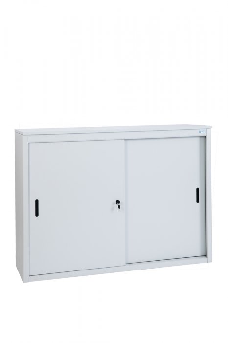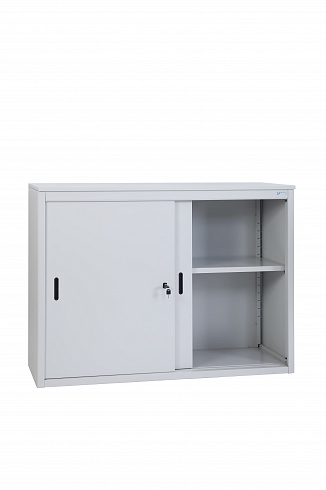 Низкий односекционный металлический шкаф АLS 8812 комплектуется двумя раздвижными дверьми (купейного типа). Такая конструкция дверей позволяет значительно экономить место в офисе. Замок-кнопка блокирует двери и запирает шкаф. В комплект входят полка с нагрузкой до 100 кг, которую можно установить на разных уровнях с помощью зацепов. Шкаф легко собрать самостоятельно на винты и саморезы (в комплекте). Шкаф используется для хранения офисной документации и архивов, в также канцелярских и прочих офисных принадлежностей. Производитель предоставляет 3 года гарантии на шкаф. Поставляется в разобранном виде. Шкаф окрашен порошковой краской серого цвета. Данное покрытие помогает предотвратить образование царапин и сколов, а также позволяет размещать шкаф в помещении с повышенным уровнем влажности. В шкаф можно добавить дополнительную полку (опция). При заказе от 50-ти штук можно покрасить двери в другой цвет (используется палитра поставщика). Стоимость данной услуги уточняйте у менеджера.