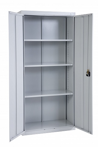 Односекционный металлический шкаф ШХА-850(50) комплектуется двумя дверьми с ригельным замком. В качестве ручки выступает фигурный гиб дверей, что экономит пространство и добавляет двери жесткости. Двери открываются до 110 градусов, а внизу шкафа есть магнит, для их фиксации в закрытом виде. В комплект входят три полки, которые можно установить на разных уровнях с помощью зацепов. Шкаф легко собрать самостоятельно на винты и саморезы (в комплекте). Шкаф используется для хранения офисной документации и архивов, в также канцелярских и прочих офисных принадлежностей. В шкаф помещается до 60 штук офисных папок шириной 55 мм. Производитель предоставляет 3 года гарантии на шкаф. Поставляется в разобранном виде. Шкаф окрашен порошковой краской серого цвета. Данное покрытие помогает предотвратить образование царапин и сколов, а также позволяет размещать шкаф в помещении с повышенным уровнем влажности. В шкаф можно добавить дополнительную полку (опция). При заказе от 50-ти штук можно покрасить двери в другой цвет (используется палитра поставщика). Стоимость данной услуги уточняйте у менеджера.