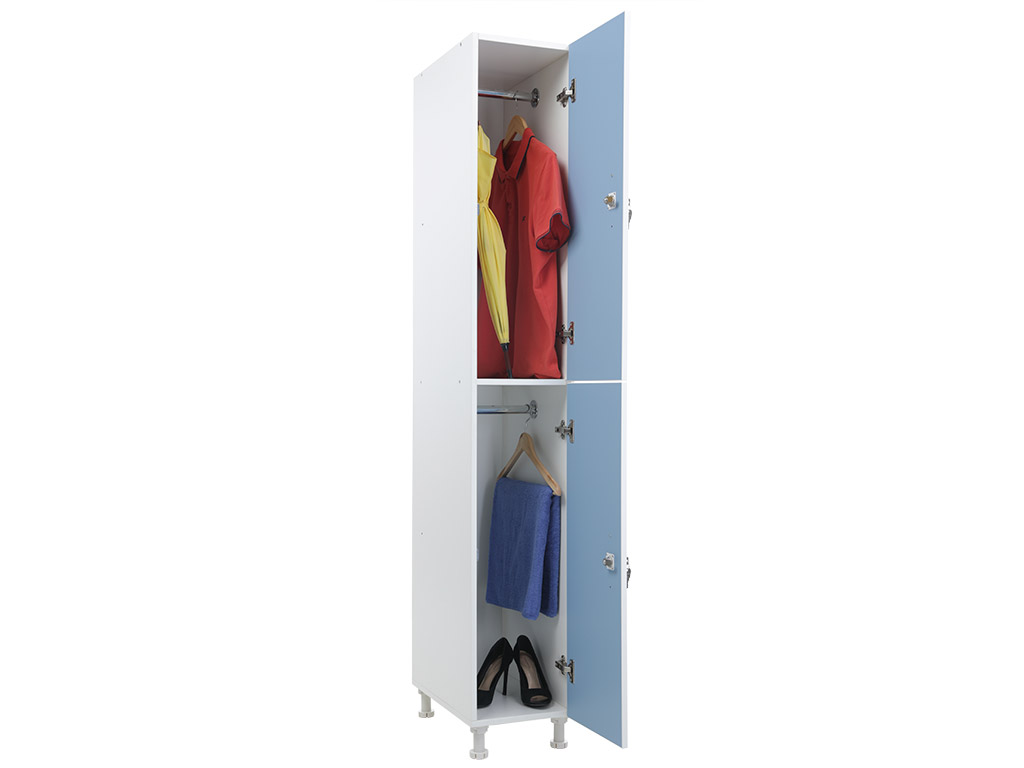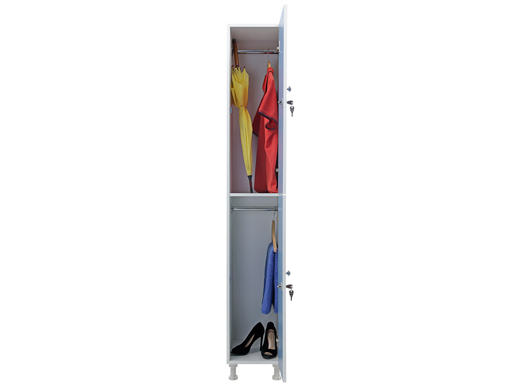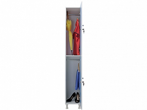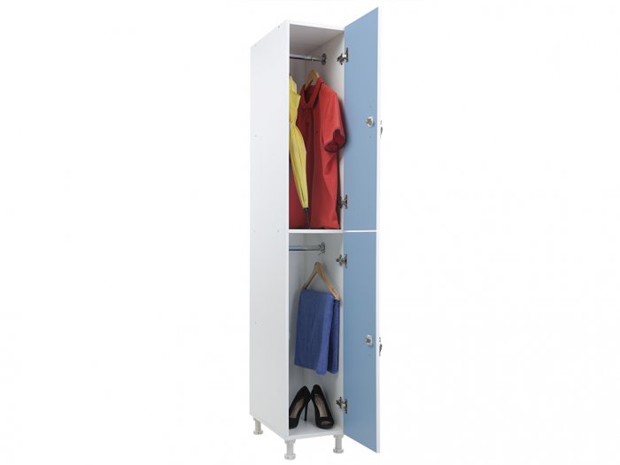 Шкаф двухсекционный вертикальный для одежды из ЛДСП толщиной 16 мм с влагостойкими и термостойкими фасадами отличный вариант для раздевалок и камер хранения в образовательных заведениях, офисных и производственных комплексов. Сдержанный дизайн в бело-голубом исполнении впишется практически в любой интерьер. Есть возможность менять направление открывания дверей. У всех шкафов задняя стенка выполнена из древесноволокнистой плиты высокой плотности (ХДФ ) толщиной 3 мм. В шкафу предусмотрены металлическая ручка, замок с ключом, а также регулируемые опоры для хорошей устойчивости на неровных полах. Все шкафы серии WL можно соединить друг с другом. Шкафы серии WL поставляются в разобранном виде.
